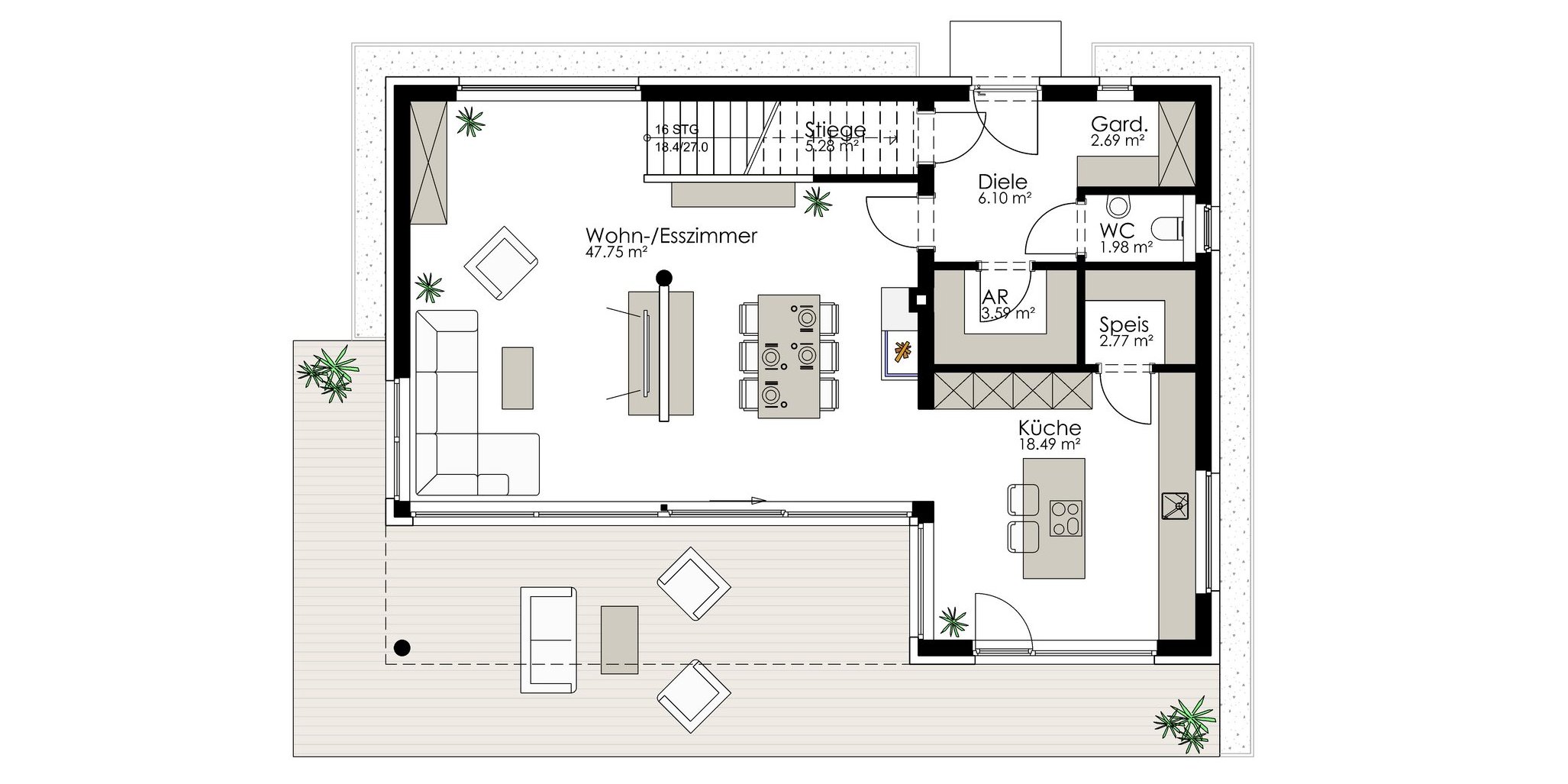 - Wohnnutzfläche EG inkl. Stiege: 88,65 m²