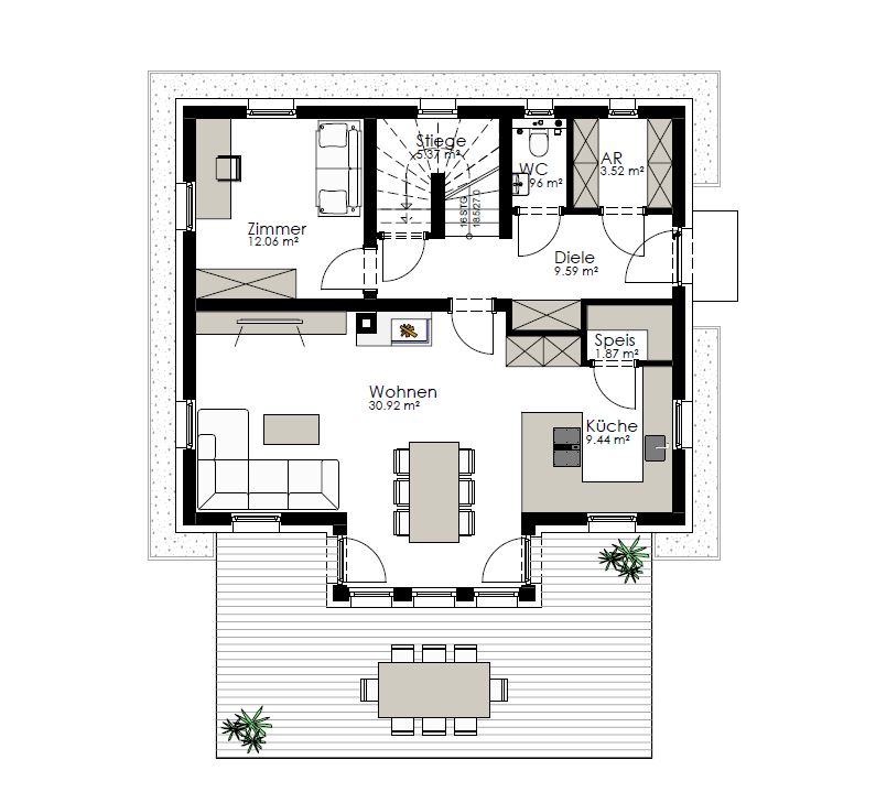 Inkl. Erdwärmeheizung, sanitärer Rohinstallation, Elektroinstallation, Beschattung und Rauchfang