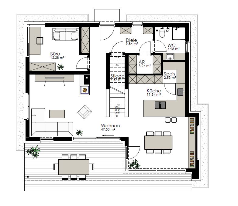 Inkl. Erdwärmeheizung, sanitärer Rohinstallation, Elektroinstallation, Beschattung und Rauchfang